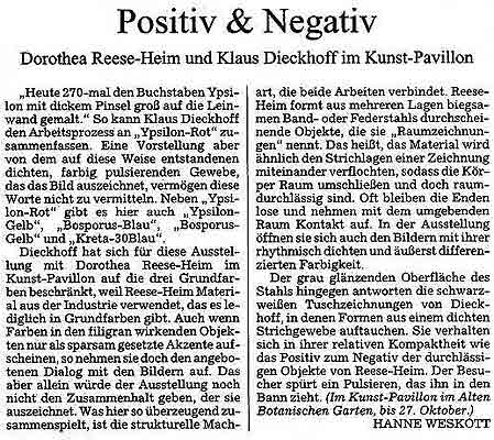es große Vorbilder, bei denen sich Dieckhoff inspiriert hat. Sowohl Jasper Johns als auch Cy Twombly haben sich mit ähnlicher Problematik beschäftigt. Jasper Johns eher mit Strichstrukturen, wie sie vor allem in den Papierarbeiten von Klaus Dieckhoff auftauchen, Cy Twombly eher mit graphischen Skripturen. So verteilt Twombly Striche, Buchstabenkürzel, Kritzeleien auf der Leinwand ohne scheinbares System - und intendiert dabei einen ebenso poetischen wie auch schwerelosen Schwebezustand zwischen Ruhe und Unruhe, zwischen erkennbaren, an Buchstaben oder Zahlen angelehnten graphischen Strukturen und einer rein expressiven Formensprache, zwischen unreflektierter, dafür umso authentischer Kinderzeichnung und ausgefeiltem künstlerischen Kalkül. Einen solchen Schwebezustand führt Dieckhoff besonders auch in seinen Papierarbeiten vor, die in seinem Werk eine ganz eigene Kategorie bilden. Die Werke, die sie hier sehen, sind allesamt Originale, also keine Auflagen-Arbeiten, und schon die Akribie und der Aufwand der Herstellung beeindrucken unmittelbar. "Kunst ist schön - macht aber viel Arbeit" bemerkte schon Karl Valentin ebenso lakonisch wie zutreffend. Die unzähligen Strichlagen, aus denen sich die Blätter zusammensetzen, scheinen schon fast an meditative Versenkung zu grenzen - ähnlich etwa den Zahlenbildern von Roman Opalka, der seit annähernd 30 Jahren Zahlen malt. Künstlerisch geht es hier in erster Linie um das Finden und Herstellen einer Synthese aus verschiedenen Gegensatzkonstellationen: Makro- und Mikrostrukturen, mikroskopisch kleine Strukturen und dynamisch hingeworfene Tuschstriche werden miteinander konfrontiert, freier gestischer Ausdruck mit strenger Konstruktion. Den tausendfach sich wiederholenden kleinen Strichlagen werden große gestische Tuschpinselzeichnungen gegenübergestellt, die einerseits sich von den monotonen Mikrostrichen herausheben, aber in ihrer seriellen Reihung das gestische-Singuläre wieder zurücknehmen. All das sollen keine Erklärungen sein, sondern Gedanken um die Bilder und Papierarbeiten, Mosaiksteinchen auf dem Weg zu einer Annäherung, die letztlich jeder selbst versuchen und leisten muss. Reinhard Spieler |