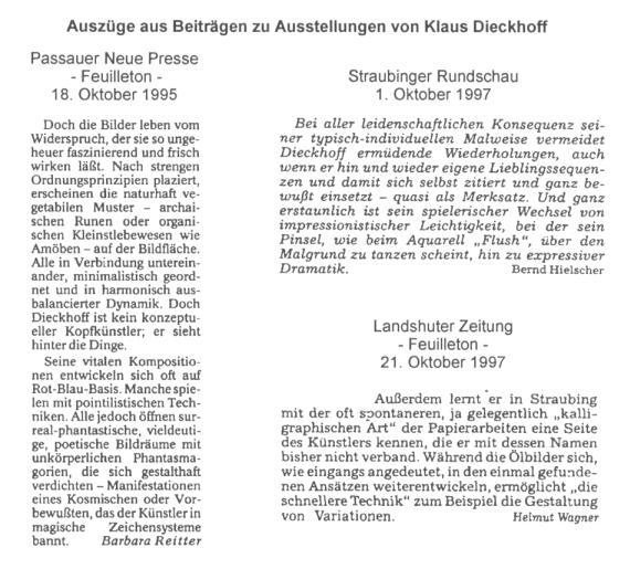 Bis zum 14. Juli stellt Klaus Dieckhoff im Stadtmuseum Deggendorf aus. Vorausgegangen sind Ausstellungen in Kloster Asbach (1992), in der Villa Beck in Osterhofen (1994) und im Kunstpavillon am Stachus in München (1995). Näch-ste Woche eröffnet Klaus Dieckhoff eine Ausstellung in Rosenheim. Klaus Dieckhoff ist nicht Hobbymaler, er lebt von seiner Kunst. „Das setzt natürlich voraus, daß man immer am Ball bleibt“, so Klaus Dieckhoff. „Ich habe ein sehr schönes zweites Atelier in München am Max-Weber-Platz, einige meiner Bilder sind im Besitz bedeutender Sammlungen in München und ich gehöre auch vielen Künstler-Organisationen an. Ich habe mich sehr darüber gefreut, daß führende Persönlichkeiten aus dem ostbayerischen Raum bei meiner Vernissage in Deggendorf mit dabei waren.“ Inzwischen arbeitet Klaus Dieckhoff schon wieder an neuen Bildern: „Ziel für die Zukunft sind wahre Farborgien, mit denen ich meinen Betrachtern wirklich Freude bereiten kann.“ Von Hans Erhart |